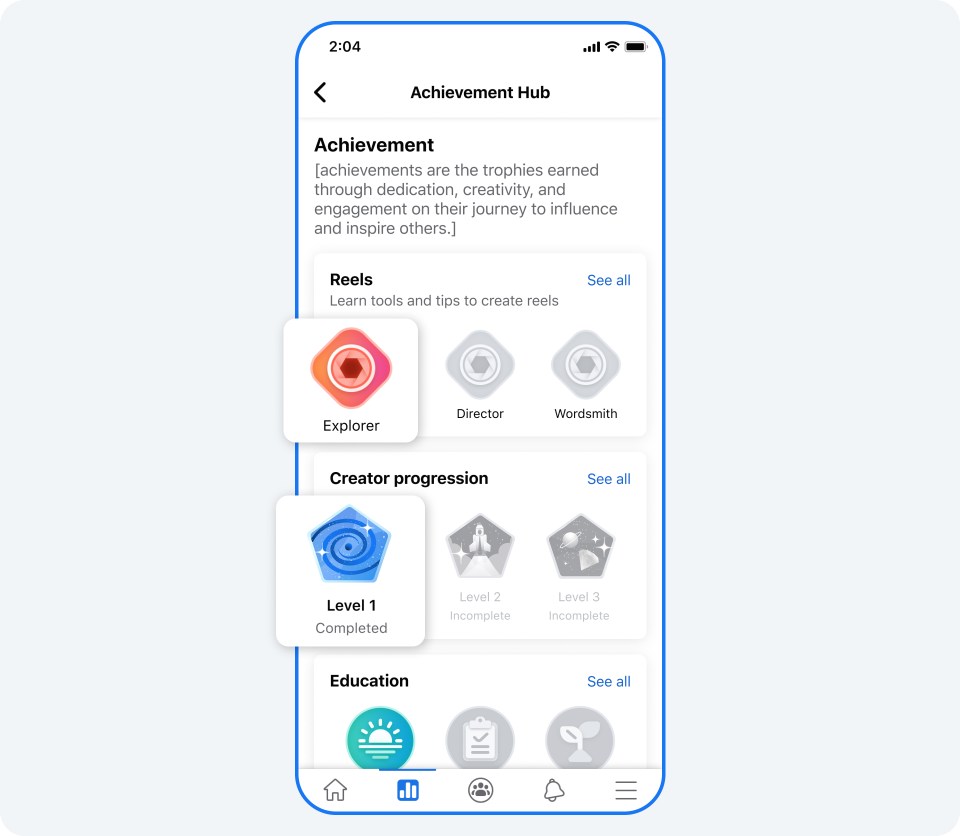 Nous lançons l’espace Succès dans le tableau de bord professionnel. Vous pourrez y consulter tous vos succès en matière d’éducation, d’Étoiles, de reels et de progression en un seul endroit. Un nouveau succès fait également son apparition, il s’agit des séries de reels. Pour l’obtenir, il suffit de publier des reels chaque semaine.