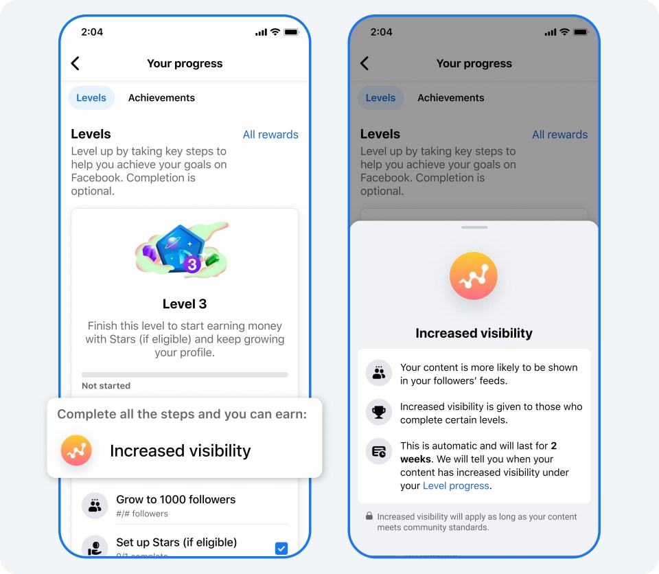 Si ces succès vous aideront à eux seuls à évoluer sur Facebook, nous souhaitons les rendre encore plus avantageux. Pour cela, nous testons actuellement des récompenses pour les différents moments clés. Les Creators qui terminent tous les niveaux de progression peuvent prétendre à une visibilité accrue sur le fil ou à la mention Creator tendance sur leur page ou leur profil afin d’être davantage visibles.