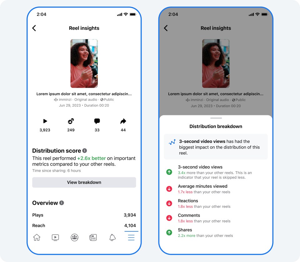 Nous avons également déployé de nouveaux indicateurs pour les reels sur le tableau de bord professionnel. Il y a notamment la couverture spécifique des reels pour les followers et les non-followers, un score de répartition indiquant les performances de votre reel par rapport à d’autres, et un graphe de rétention d’audience pour illustrer la durée de visionnage d’un reel par votre audience et quand celle-ci a arrêté de le regarder. Nous procédons également à une mise à jour de nos indicateurs sur les lectures de reels afin d’y faire figurer les relectures. Vous pourrez ainsi déterminer les performances de chaque reel et ceux qui plaisent le plus à votre audience.