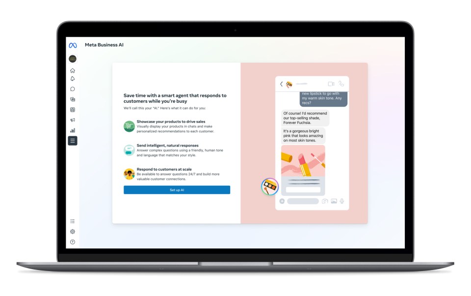 Estamos ampliando nuestras IA empresariales a miles de todas las empresas que utilizan anuncios de clics en WhatsApp y Messenger en inglés, para que puedan configurar rápidamente IA empresariales que puedan hablar con sus clientes, ofrecer asistencia y facilitar el comercio. Desde responder a las preguntas más habituales de los clientes hasta hablar sobre productos y finalizar una compra, estas IA empresariales pueden ayudar a las empresas a captar más clientes y aumentar las ventas.