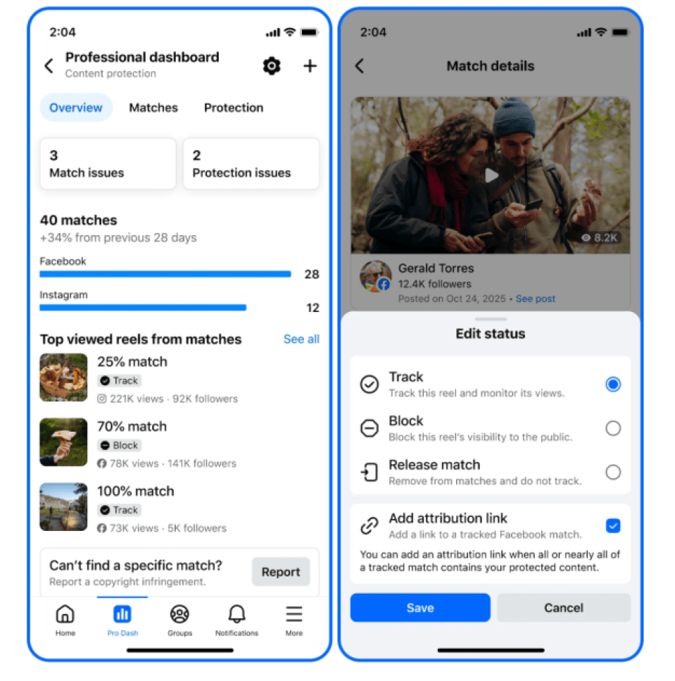 Content Protection analizará de forma continua Facebook e Instagram para detectar coincidencias con los Reels protegidos, ya sean coincidencias completas o parciales. La herramienta utiliza la misma tecnología de coincidencias que Rights Manager de Meta, diseñada específicamente para creadores y optimizada para dispositivos móviles.