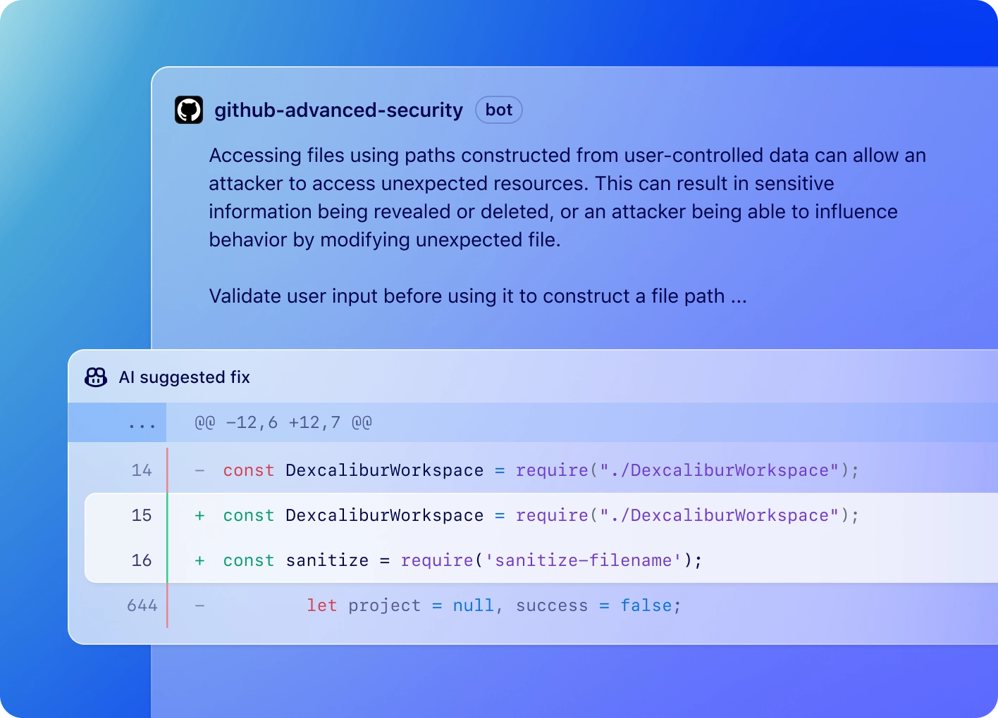 Don’t just find vulnerable code, fix it. GitHub Advanced Security flags problems and suggests AI-powered solutions, freeing teams to ship more secure software faster.