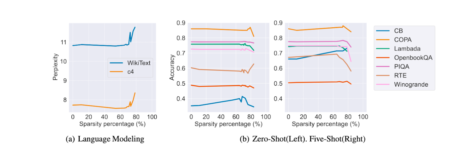 Figure 2: Downstream accuracy of sparsified OPT using Deja Vu sparse predictors. Little to no degradation in performance is observed, even at very high sparsity levels.