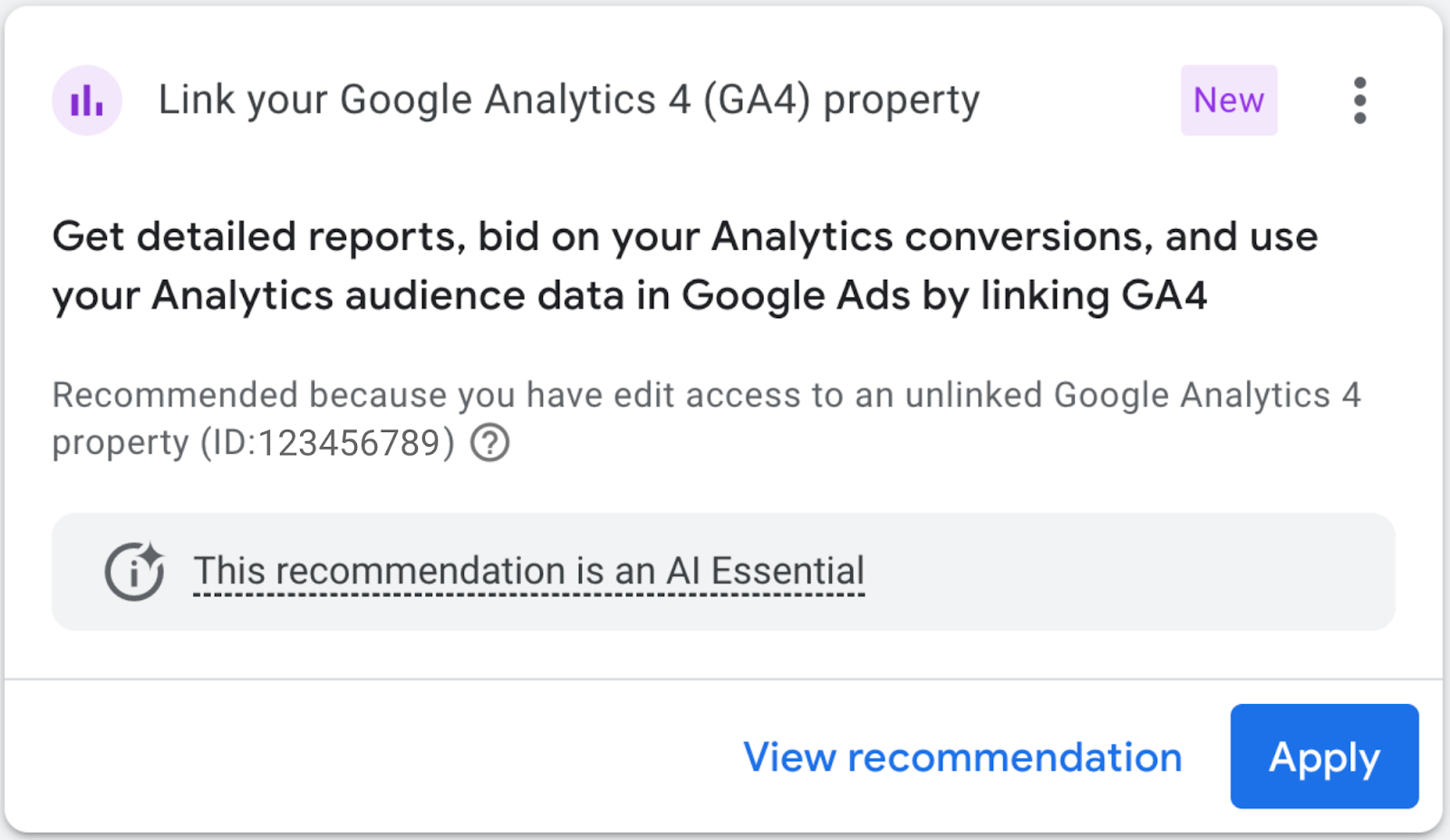 When you're running advertising campaigns in Google Ads, we now surface a recommendation that identifies unlinked Google Analytics properties and allows users to link them to their Ads account(s) with one click. The new recommendation appears in the Recommendations section of the Campaigns page in the Google Ads console for eligible users (those that have the necessary permissions on the Ads account and Analytics property).
