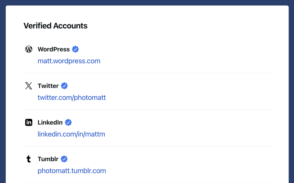 A verified account is a service that has been linked to a Gravatar profile using the service’s login credentials. We consider this to be “Verified” because the Gravatar user has proven they own that service’s login credentials. Verified accounts are verified at the moment they are added to the profile. We currently don’t periodically re-validate the service to ensure it still exists or is still owned by the user (in cases where an account may be taken away from a user).
