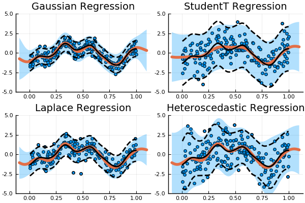 - StudentT : The standard Gaussian Process regression with a Student-t likelihood (the degree of freedom ν is not optimizable for the moment) IJulia example/Reference